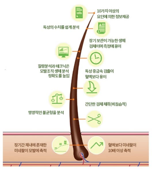 중금속 과다를 확인할 수 있는 가장 간단한 검사는 '모발검사'입니다.