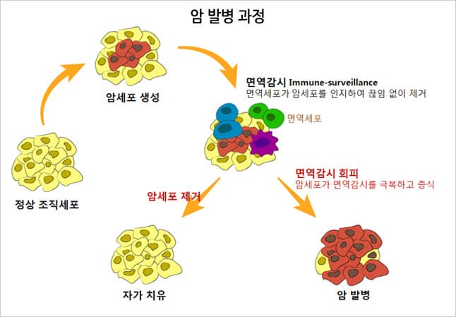손상된 세포들 중에 약 3천~4천 개는 암세포가 되는데요. 우리의 몸의 면역세포 중 NK세포가 이 암세포들을 추적하여 죽입니다. 암세포 중에 면역세포를 피해 도망 다니며 성장하면 이것이 암이 됩니다.