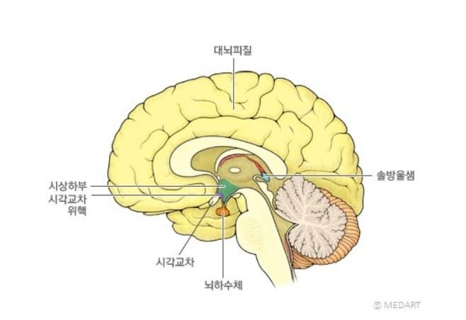 · 어둠 감지 → 해가 지고 어두워지면 송과선이 활성화되며 멜라토닌 분비가 증가합니다.